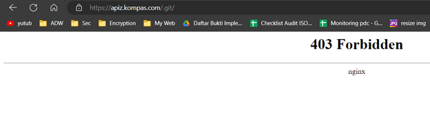 403 Forbidden. Ketika respons yang didapat 403 forbidden berarti pada directory tersebut terdapat directory dan files yang lainnya. Saya ragu untuk melakukan scanning menggunakan tools git Dumper, karena saya berpikir pasti terdapat WAF atau max limit request pada website/directory tersebut.