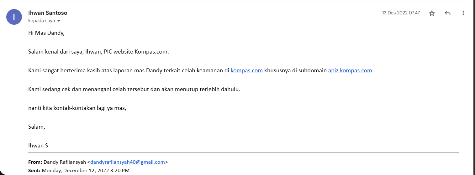 Setelah saya mencari-cari kontak person IT internal-nya, akhirnya saya mendapatkan kontak Head of IT at Kompas.com yang bernama Bapak Ihwan Santoso, lalu saya melaporkan temuan BUG ini pada tanggal 12 Desember 2022.