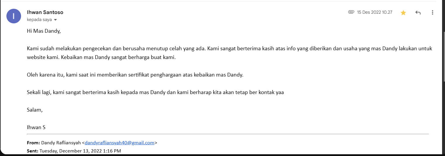 Lalu di tanggal 15 Desember, Pak Ihwan mengirimkan email kembali, dan mengonfirmasi bahwa BUG sudah dilakukan perbaikan serta mengucapkan terima kasih dan mengirimkan Sertifikat Apresiasi.