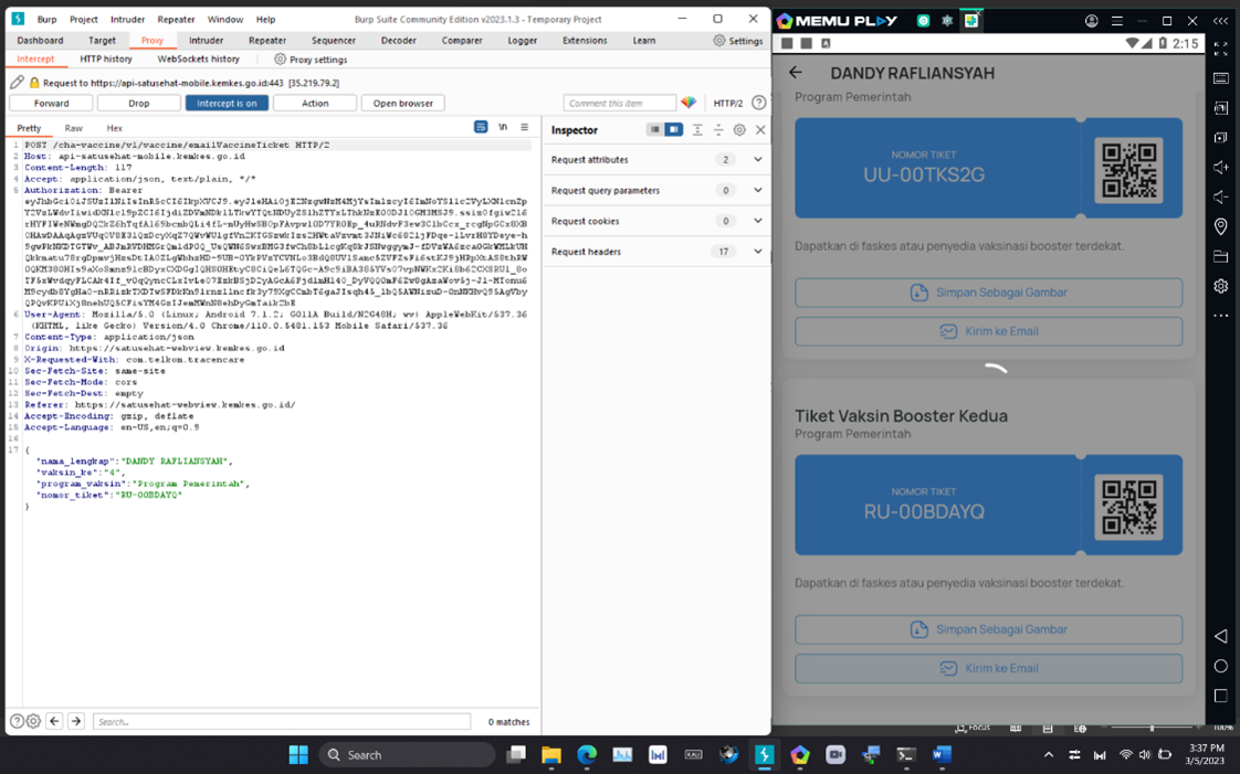 Selanjutnya saya menuju ke tiket vaksin dan melakukan intercept request dengan menggunakan Burpsuite