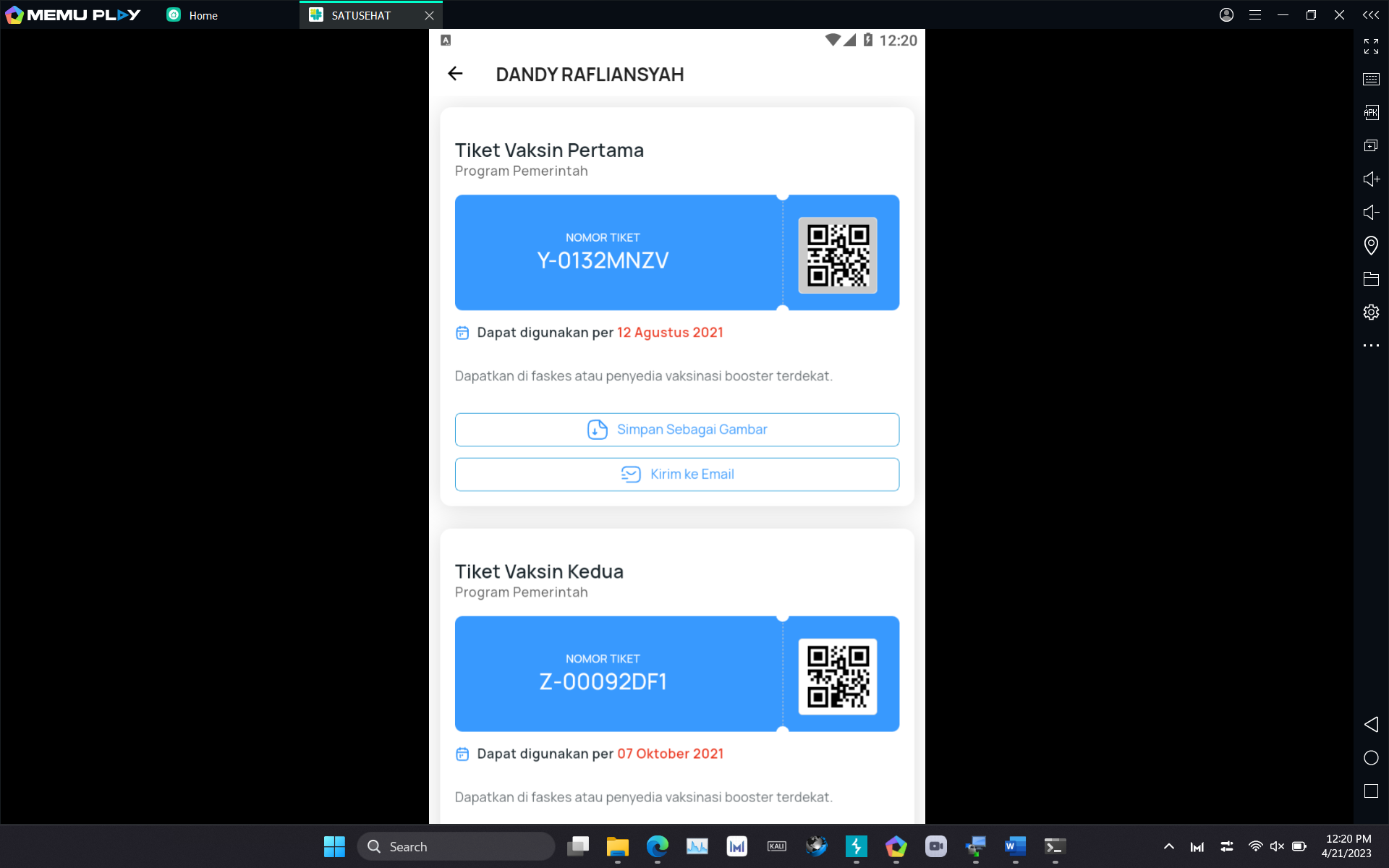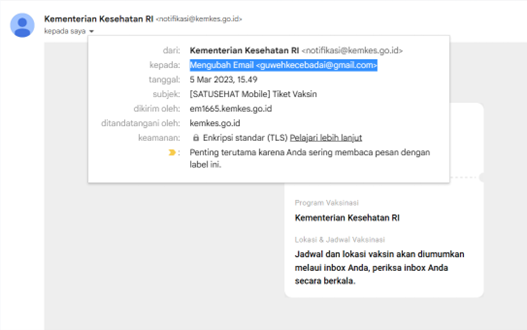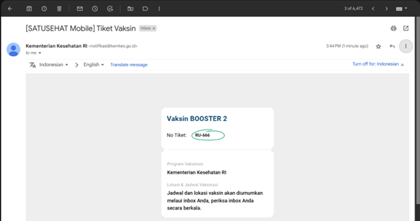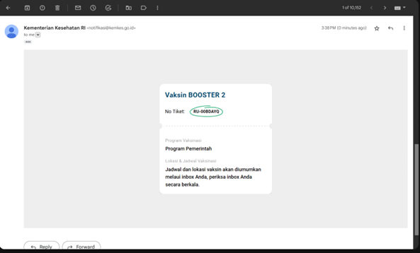Lalu saya melakukan resend request yang berhasil di intercept tadi, dan saya mendapatkan email informasi tiket vaksin saya