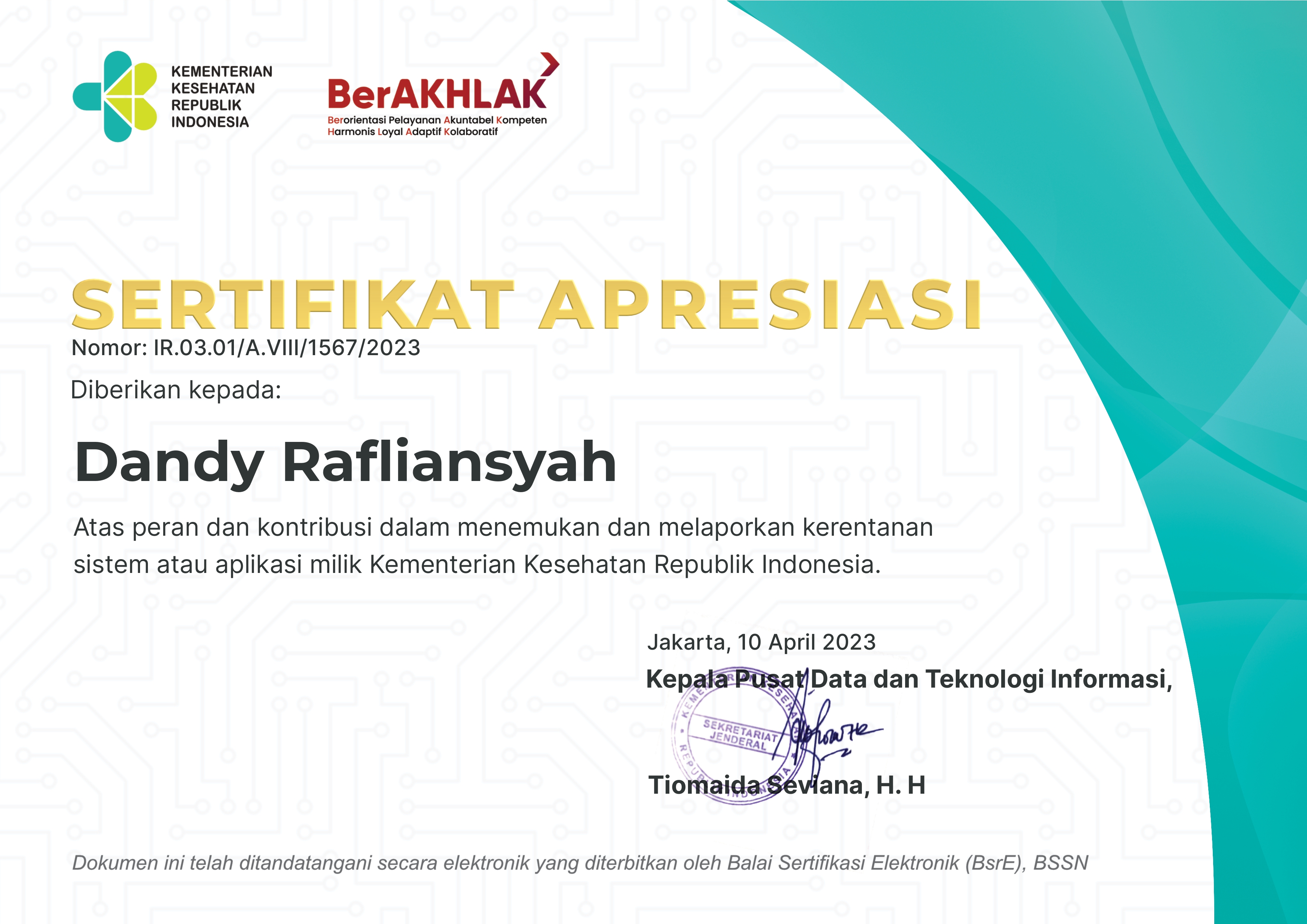 Vulnerability sudah dilaporkan ke tim CSIRT Kementerian Kesehatan RI, dan sudah dilakukan perbaikan.