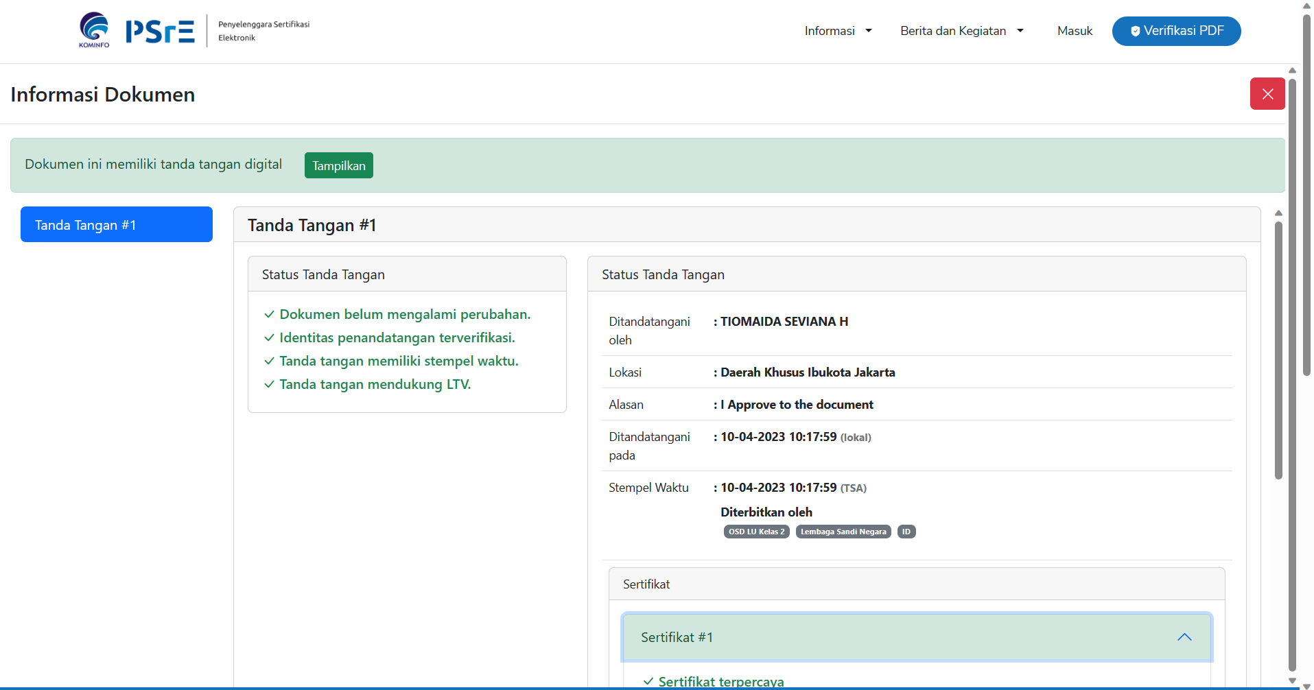 e-Sertifikat valid dan sudah ditandatangani secara elektronik