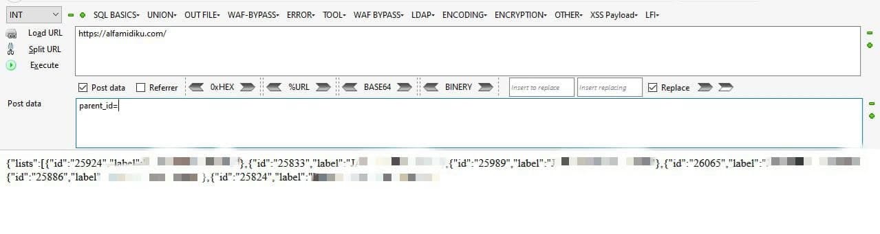 Ketika saya melakukan inject dengan menggunakan Single Quote pada parameter parent_id respons nya menjadi Blank, saya yakin bahwa vulnerability SQLI