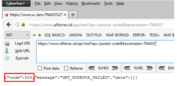 Selanjutnya saya melakukan injeksi di parameter kecamatan dengan single quote, maka responsnya code error 500
