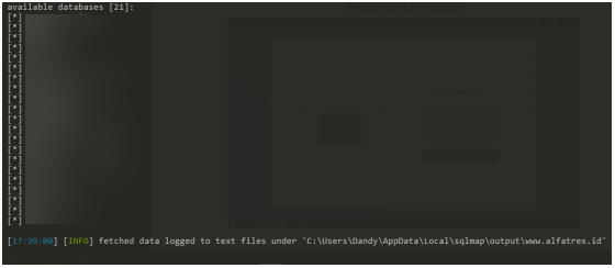 Selanjutnya saya melakukan scan di SQL Map, dan hasilnya saya mendapatkan 21 database