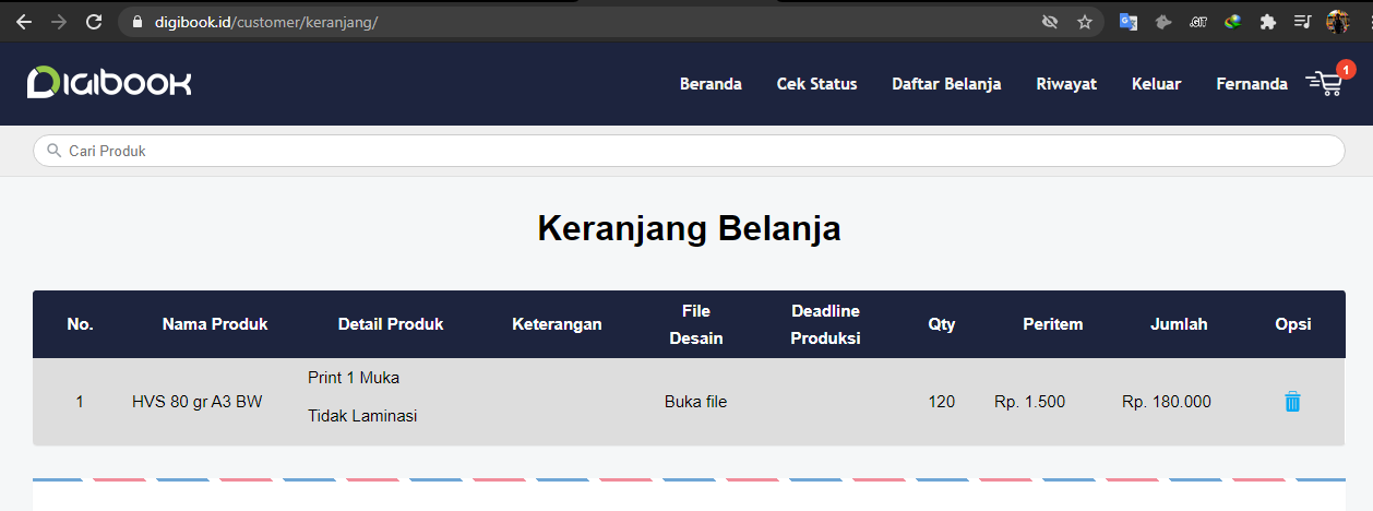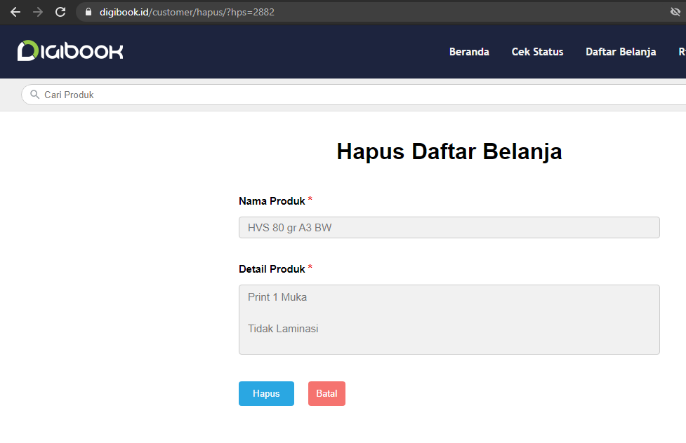 Sebelumnya saya sudah melakukan register di website digibook.id, dan saya mencoba untuk menambahkan produk ke dalam keranjang belanja saya, maka akan seperti ini