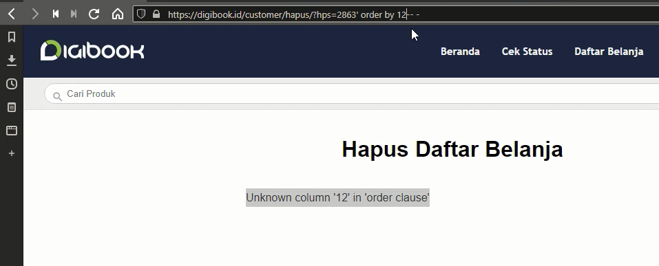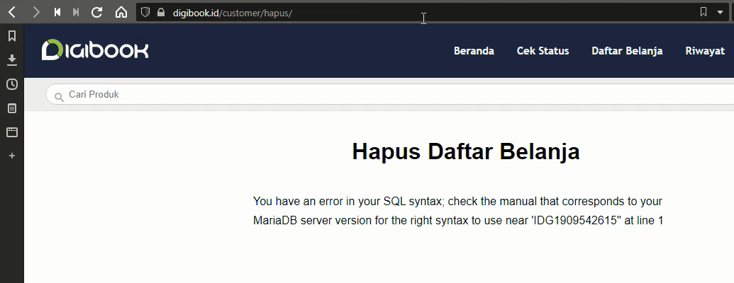 Saya melihat ada parameter ?hps= pada URL, maka saya mencoba untuk menambahkan single quote pada parameter tersebut, guna untuk memastikan apakah vulnerable SQL Injection atau tidak. maka respons nya adalah