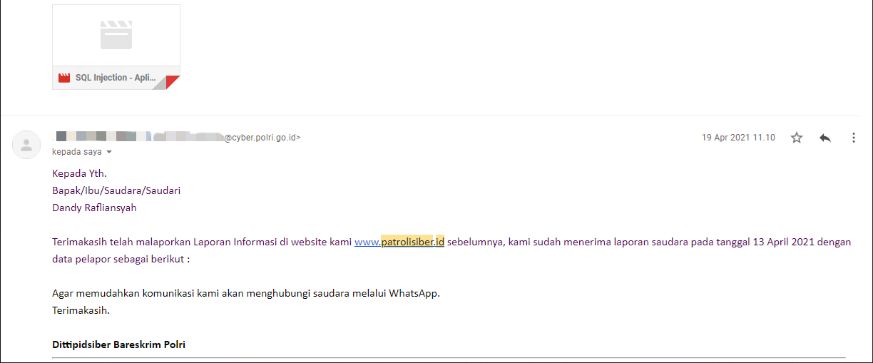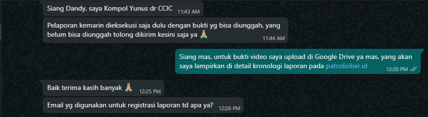 Report sudah selesai, dan sudah ditangani oleh Kompol Yunus dari CCIC Polri