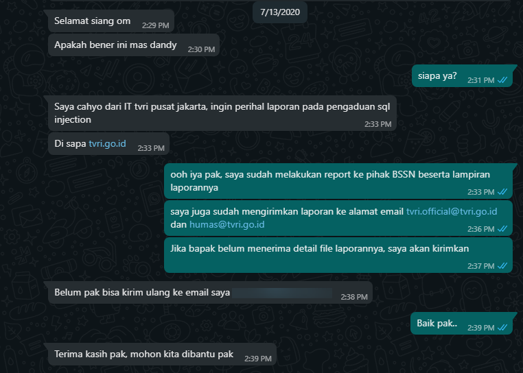 13 Juli 2020 = IT TVRI Pusat Jakarta menghubungi saya melalui WhatsApp & BUG Di Proses Patch